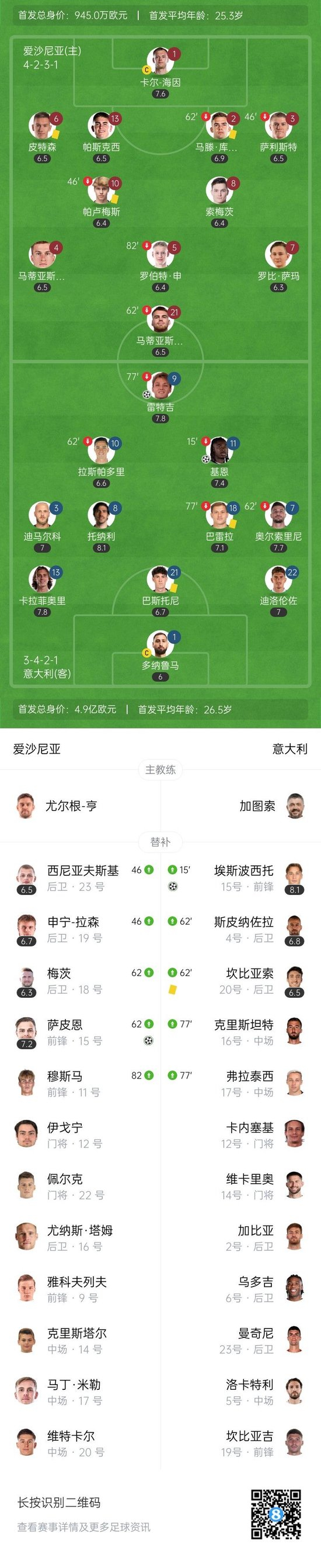 上半场伤停补时4分钟,半场结束,意大利暂2-0爱沙尼亚。